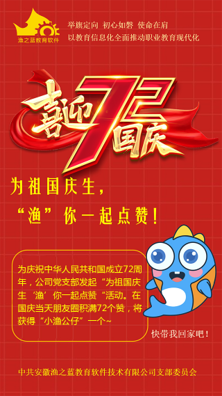 為慶祝中華人民共和國成立72周年,漁之藍(lán)黨支部發(fā)起“為祖國慶生 ‘漁’你一起點(diǎn)贊”的慶國慶送祝?;顒?dòng)!公司全員參與,表達(dá)最真摯的愛意和祝福,慶祝新中國成立72周年!